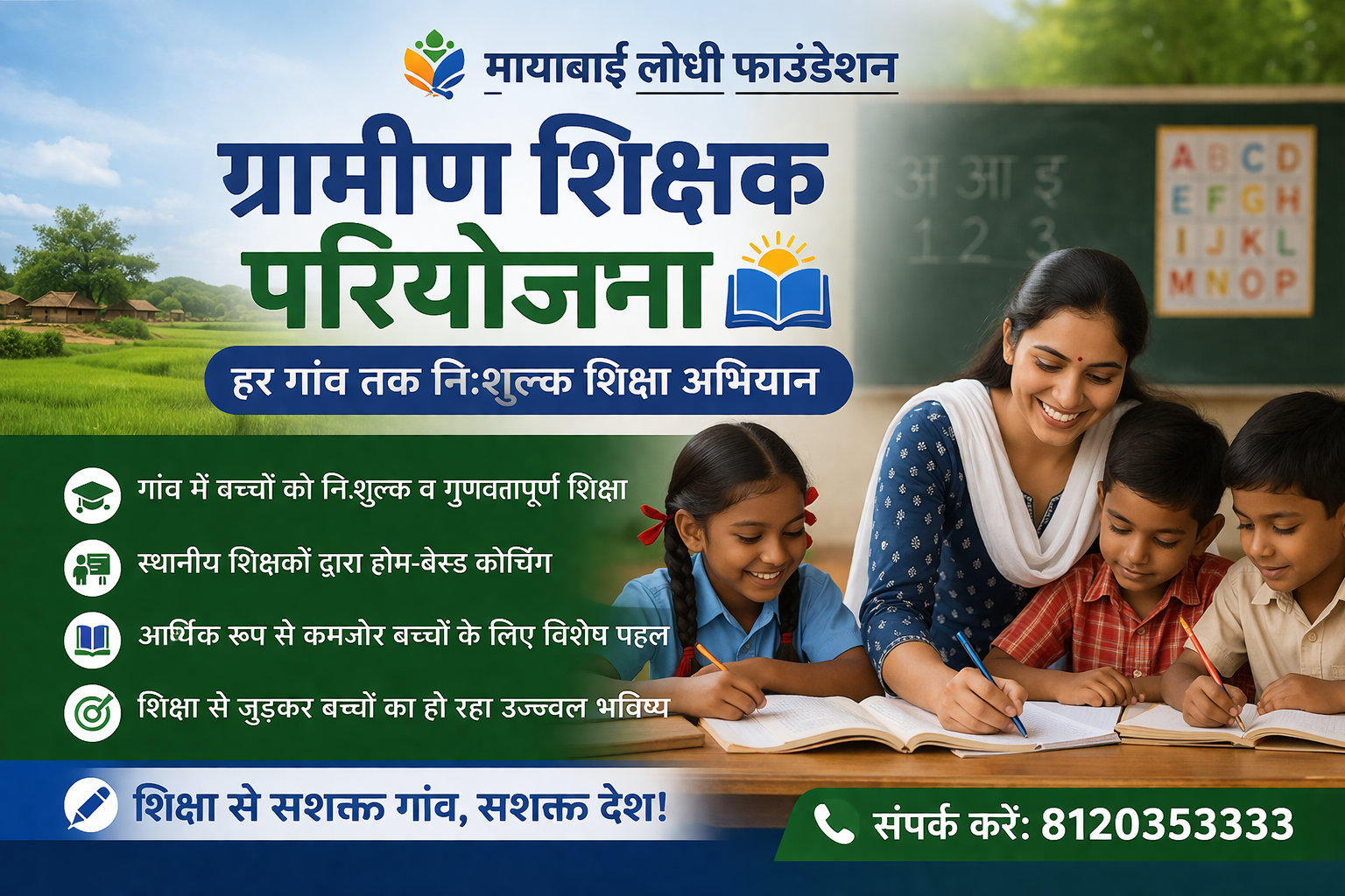 मायाबाई लोधी फाउंडेशन द्वारा संचालित ग्रामीण शिक्षक परियोजना का उद्देश्य जरूरतमंद एवं आर्थिक रूप से कमजोर बच्चों को उनके अपने क्षेत्र में निःशुल्क एवं गुणवत्तापूर्ण शिक्षा प्रदान करना है। इस पहल के माध्यम से गांव-गांव में शिक्षकों द्वारा होम-बेस्ड कोचिंग चलाई जाती है, जिससे बच्चों को शिक्षा की मुख्य धारा से जोड़ा जा सके और एक मजबूत भविष्य की नींव रखी जा सके।