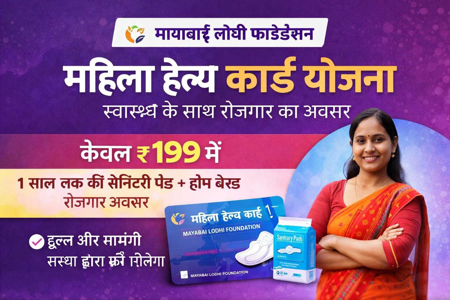 मायाबाई लोधी फाउंडेशन द्वारा संचालित महिला हेल्थ कार्ड योजना के अंतर्गत मात्र ₹199 में महिलाओं को पूरे 1 वर्ष तक हर महीने सैनिटरी पैड उपलब्ध कराया जाता है। साथ ही, इस योजना के माध्यम से महिलाओं को घर बैठे रोजगार के अवसर भी प्रदान किए जाते हैं, जिसमें आवश्यक उपकरण एवं कच्चा माल संस्था द्वारा निःशुल्क दिया जाता है। यह पहल महिलाओं के स्वास्थ्य सुधार और आर्थिक सशक्तिकरण की दिशा में एक महत्वपूर्ण कदम है। Helth Card PPT